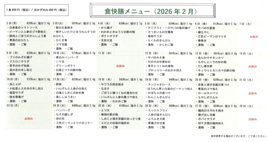 2026/01/22 / 最終更新日時 : 2026/01/22 wp-km 弁当 2月食快膳弁当メニュー 1食650円で配達も行っております。(遠方の場合、配達料別途30円頂きます)お電話からご注文いただけます。