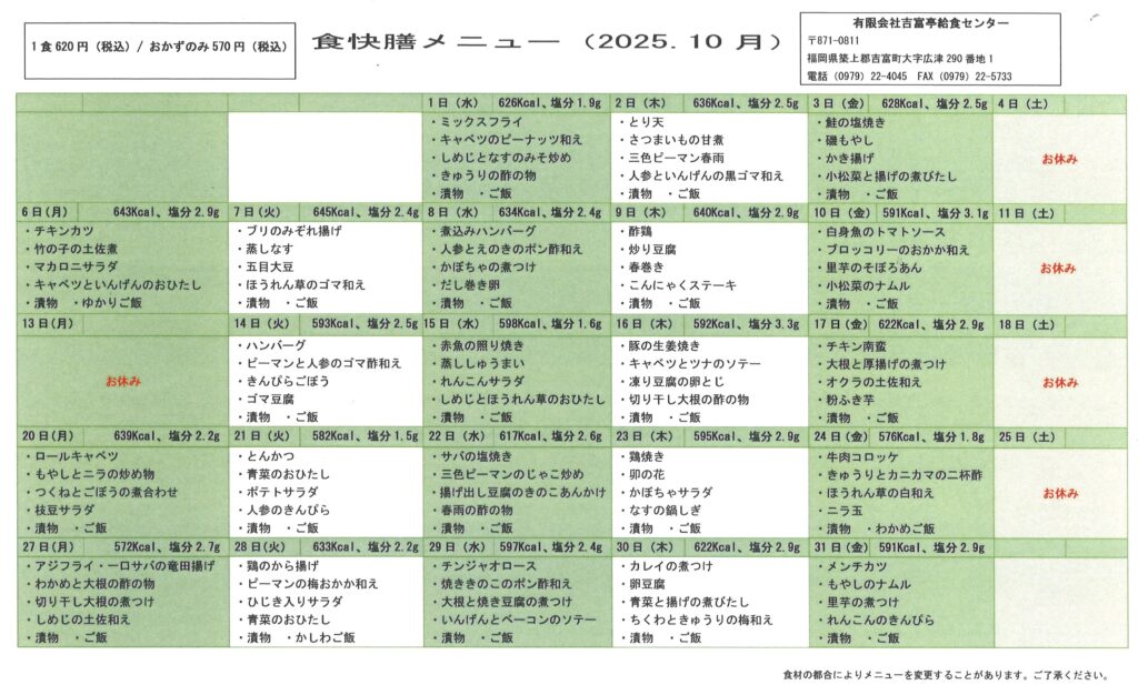 2025/09/22 / 最終更新日時 : 2025/09/22 wp-km 弁当 10月食快膳弁当メニュー 1食620円で配達も行っております。(遠方の場合、配達料別途30円頂きます)お電話からご注文いただけます。