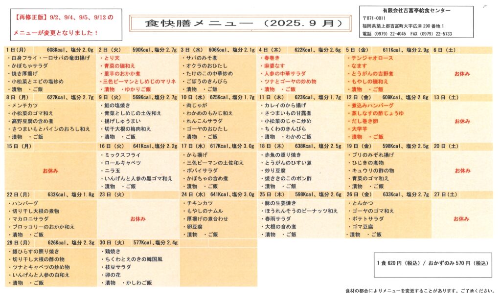 2025/08/26 / 最終更新日時 : 2025/09/22 wp-km 弁当 9月食快膳弁当メニュー 1食620円で配達も行っております。(遠方の場合、配達料別途30円頂きます)お電話からご注文いただけます。